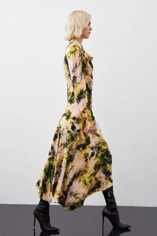 Abstract Print Viscose Satin Asymmetric Woven Maxi Dress
