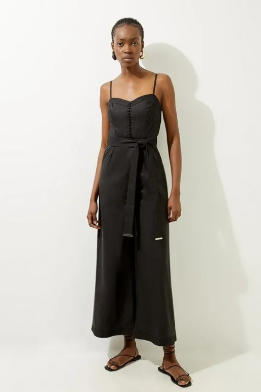 Feel confident in our jumpsuit, with high quality, lightweight cotton fabric, as well as an ultra comfortable wide leg fit, and a bodice with button detailing and a sweetheart neckline. Style it with block heels or ankle boots for a look perfect for office days or casual days out, then wear it with heeled boots or strappy heels for an evening look.Cotton Top Stitch Pleated Woven JumpsuitHigh Quality Cotton FabricStatement Wide Leg FitSweetheart NecklineButton Detailing on BodiceBelted Waist FeatureAdjustable Spaghetti StrapsDetails & Care100% Cotton. 30 degree synthetic cycle. Model wears UK 10. Length measures 77cm