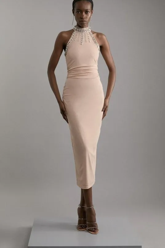 Crystal Embellished Power Mesh Jersey Midi Dress