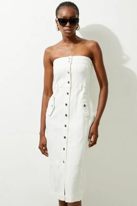 Feel confident in our midi dress, made in classic denim fabric, featuring a minimal bandeau desing, with button front detailing and a strapless, bandeau neckline. Style it with anything, from trainers or loafers for a casual approach, then strappy sandals or heels for an evening look.Denim Bandeau Button Through Midaxi DressHigh Quality Denim FabricFlattering Fitted SilhouetteBandeau NecklineButton Front DetailingPocket FeaturesDetails & Care100% Cotton. Wash with similar colours. Cool iron on reverse. Wash inside out. Model wears UK Size 8/ US Size 4. Model height approx: 5″9. Length approx: 105cm