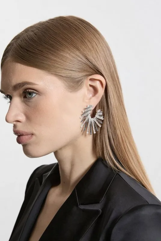 Polish off an occasion look with a pair of statement earrings. Featuring a large, fan design, these earrings are perfect for injecting some personality into your look. Wear them on wedding guest days, to party nights, and holiday evenings.Diamante Fan Statement Stud Earring Shimmering, Metallic Colouring Sparkling Diamante DetailingUnique Fan DesignStatement Large SizeSecure FasteningsDetails & CareDesigned in London our Karen Millen Jewellery collection always offers on trend and chic products in a premium plated finish. The collection is a great way to finish off and personalize any outfit and can be the perfect gift for a friend or loved one. Care: Wipe with soft dry cloth. Dimensions: 2.1cm / 5.6 x 1.5cm. Products must be removed before showering, bathing, grooming and must not come in contact with any chemicals or abrasives. Jewellery comes in a Karen Millen dust bag. 67%ZINC 20%STEEL 10%GLASS 3%TITANIUM.