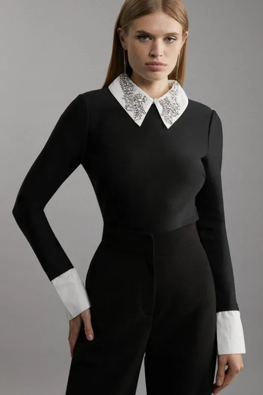 A sophisticated choice for party season and beyond, this long sleeved top can be styled for multiple occasions. A statement collar is embellished with claw crystals for a glamorous touch, and figure form bandage fabric hugs the silhouette.Figure Form Bandage Embellished Collar Knit TopLong SleevesCrystal Embellished CollarFigure Form Bandage FabricDetails & Care97% recycled polyester, 3% elastane. 30 degrees synthetic cycle. model wears a Small.