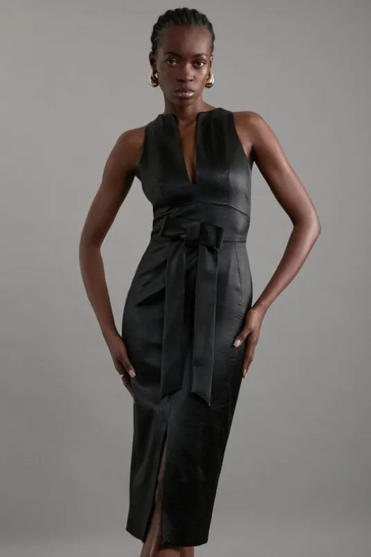 Experience pure opulence in our midi dress, made with shimmering satin, featuring a deep V neckline and a figure hugging silhouette, and a large bow for a touch of playful glamour. Style it with block heels or strappy heels for a look perfect for wedding guest days and prom nights.Italian Structured Satin Bow Detail Tailored Midi DressHigh Quality, Smooth Satin FabricFlattering Fitted SilhouettePlunging V NecklineStatement Bow Belt at WaistlineThigh High Leg SplitZip Fastening in BackDetails & Caremain 75% acetate, 22% polyamide, 3% elastane/spandex. lining 100% polyester. dry clean only. model height 5″9. model wears size 10. item length 135cm