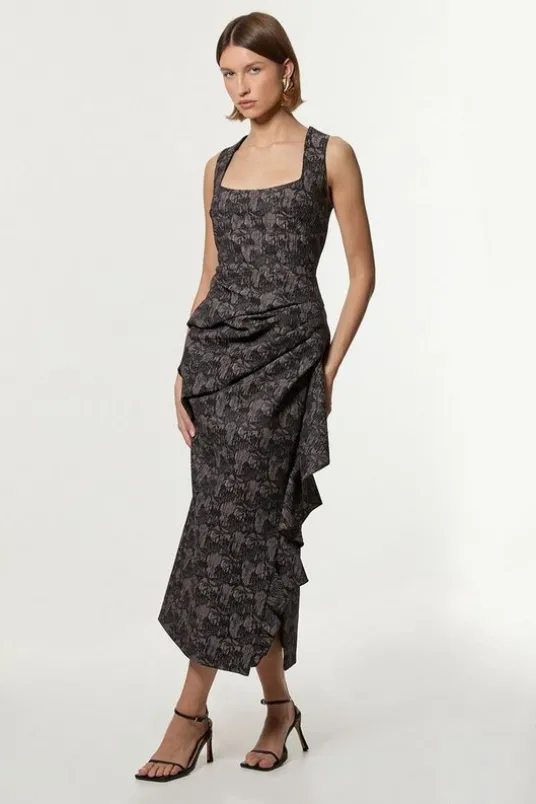 Jacquard Ruffle Strappy Tailored Midi Dress