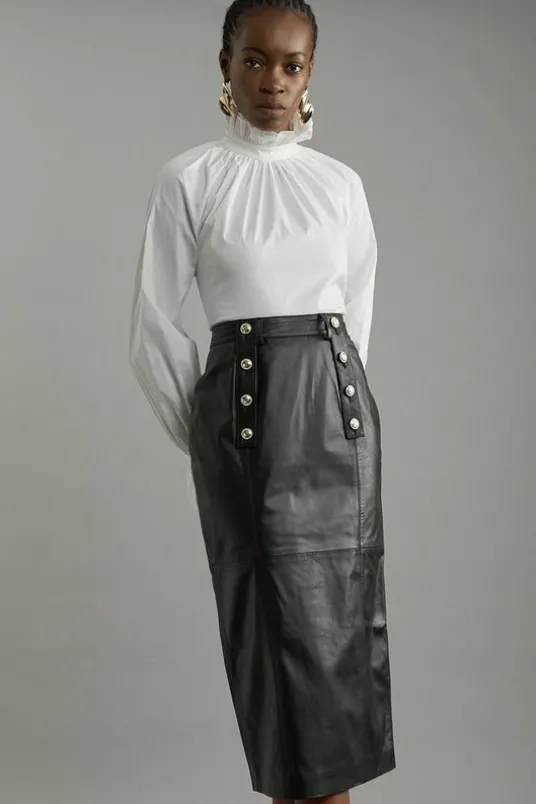Experience sleek tailoring with our leather pencil skirt. Made with supple leather fabric, a tailored fit and military button detail, this verstaile midi skirt can take you from day to night. Style with knitwear or basic t-shirt and flats for a more casual look, or dress it up with a blouse and heels. Leather Military Button Pencil Midi SkirtHigh Quality, Soft Real LeatherComfortable High WaistlineBelt Loop FeaturesFlattering Tailored FitMilitary Button DetailMidi LengthDetails & Care100% Leather, Lining 100% Polyester. Do Not Clean Garment. Model wears size 10. Centre Back Length Approx. 85cm
