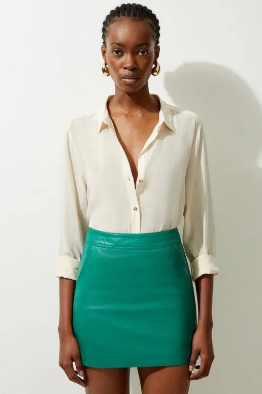 Experience updated wardrobe essentials with our mini skirt, made in supple leather, with a fitted silhouette and a high waistline, creating an ultra flattering fit. Style this piece with anything, from a blouse and strappy heels, to a knit jumper, tights, and boots.Leather Mini SkirtHigh Quality, Soft Real LeatherSleek, Minimal DesignComfortable High WaistlineFlattering Figure Hugging SilhouetteMini LengthPocket FeaturesZip Fastening in BackDetails & Care100% Leather. Lining: 100% Polyester. Model wears UK Size 8/ US Size 4. Model height approx: 5″9. Item length 41cm