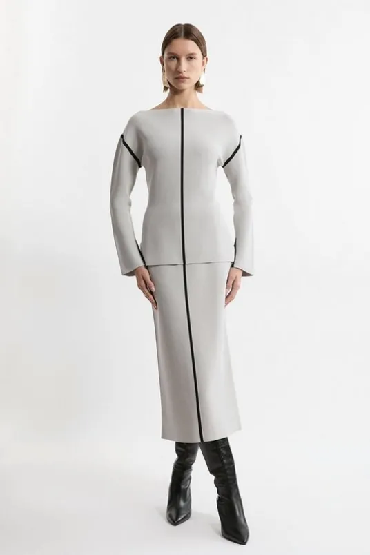 Feel elegant in our knit skirt, with a straight silhouette, contrasting trim details, and a high waistline. Style this piece with a blouse or T-shirt for an outfit that will take you from office days to wintery catch ups, then with the matching top for an effortlessly co-ordinating outfit.Milano Knit Front Split Midi SkirtHigh Quality Knit FabricHigh WaistlineComfortable, Straight SilhouetteContrasting Trim DetailsDetails & Care55% viscose/rayon, 43% polyamide, 2% elastane. 30 degrees cotton cycle. model wears a Small.
