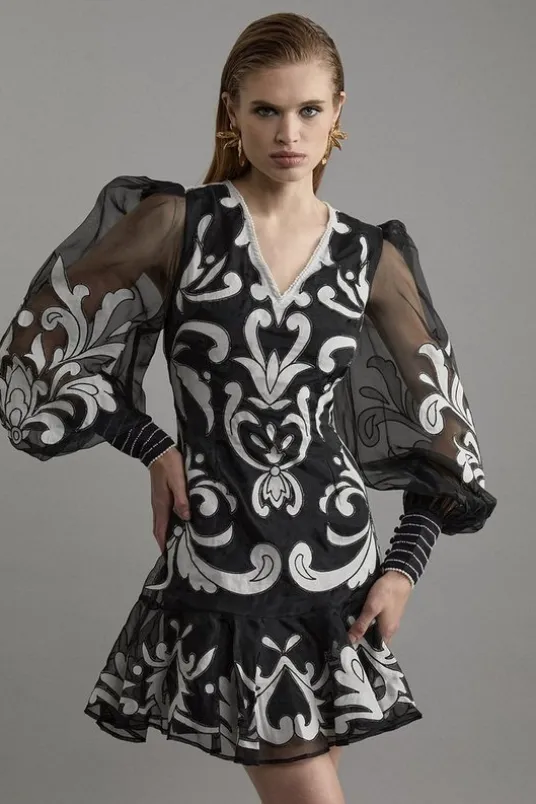 Crafted with floral applique motifs, this refined organdie dress exudes understated elegance. Delicate pearl embellishments around the neckline and cuffs create a premium polish, while sheer balloon sleeves add an ethereal element.Style: Mini DressDesign: EmbroideredFabric: WovenLength: MiniNeckline: V NeckSleeve Length: Long SleeveFrom wedding guest to race day dresses, discover our full range of formal dresses, curated for every type of celebration.Expertly designed for those 5’3″ and under, our Petite pieces are perfectly proportioned for a smaller frame using shorter lengths.Details & CareMain 100% polyester. Lining 100%Polyester. Gentle machine wash at 30 with similar colours. Model Height 5”10 – Model wears a UK 8/US Size 6. length measures 85cm