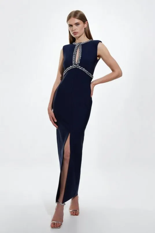 Elevate your occasion wear wardrobe with our petite maxi dress, with a bodycon fitting bodice which flows into a flared skirt, a high neckline which elevates the formality, a dramatic leg split, and sparkling embellishments. Style it with strappy heels for an occasion look that is guaranteed to turn heads wherever you step.Petite Bandage Figure Form Knit Embellished Maxi DressHigh Quality Knit FabricFigure Hugging FitFormal, High NecklineKeyhole Accent in BustStatement Sparkling EmbellishmentsThigh High Leg SplitZip Back FasteningExpertly designed for those 5’3″ and under, our Petite pieces are perfectly proportioned for a smaller frame using shorter lengths.Details & Care97% polyester 3% elastane. Gentle machine wash with similar colours. Model wears a Petite S. Length approx 130cm.