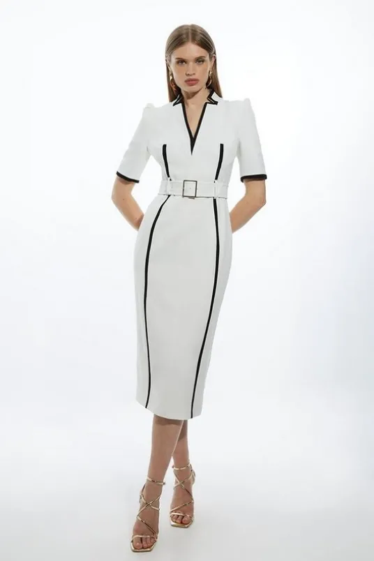 Petite Compact Stretch Contrast Tipped Forever Belted Tailored Midi Dress