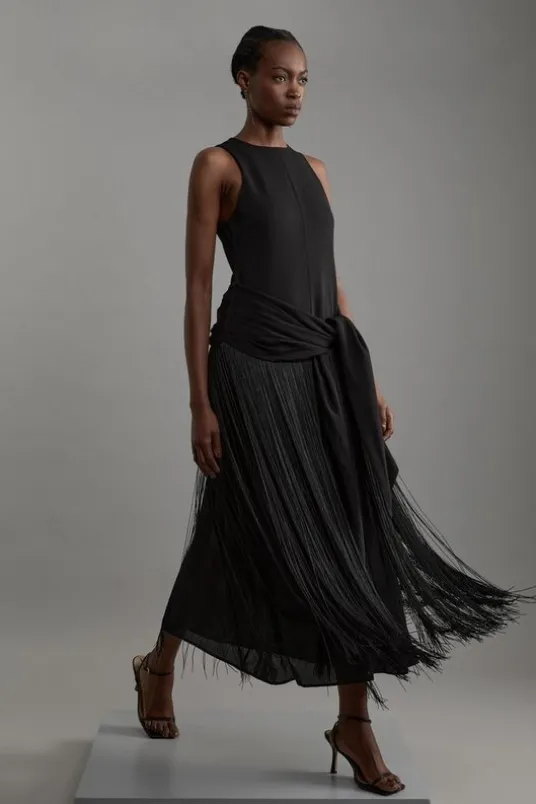 Petite Fringe Tassle Halter Neck Tailored Maxi Dress