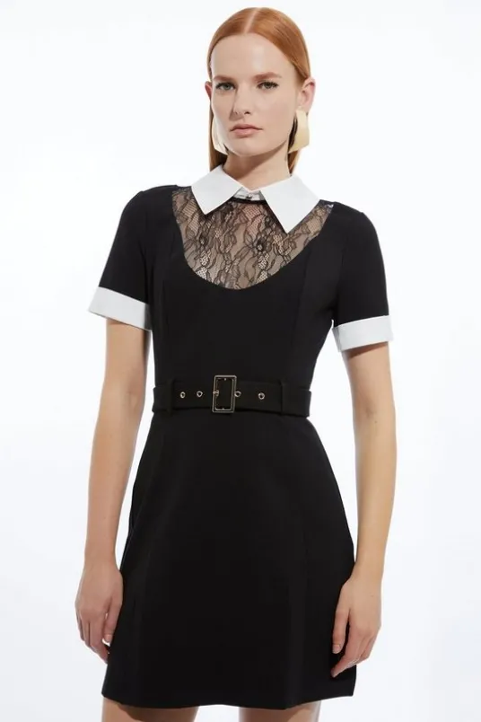 Experience elevated elegance in our petite mini dress, made with cotton fabric, featuring a comfortable and universally flattering skater silhouette, as well as intricately detailed lace inserts, and a formal collar. Style it with loafers or court heels for an office outfit, then with chunky heels for an evening look.Petite Lace Ponte Cotton Mix Jersey Mini DressHigh Quality Cotton FabricSheer Lace InsertsFlattering Fit and Flare SilhouetteBelted WaistlineFormal Collar AccentScoop NecklineScoop Back DesignShort, Flared SkirtZip Fastening in BackExpertly designed for those 5’3″ and under, our Petite pieces are perfectly proportioned for a smaller frame using shorter lengths.Details & CareMain: 68% Viscose/Rayon. 28% Polyamide. 4% Elastane/Spandex. Lace: 90% Polyamide. 10% Elastane/Spandex. Main & Contrast: 60% Cotton. 37% Polyamide. 3% Elastane/Spandex. Wash inside out.