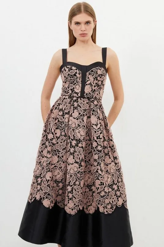 This exquisite midi dress is detailed with an intricate floral lace design. The fitted bodice complements the flared A-line skirt and flatters the figure. Style this dress with heels and accessories for an elegant evening outfit.Lace designSleevelessMidi hemlineExpertly designed for those 5’3″ and under, our Petite pieces are perfectly proportioned for a smaller frame using shorter lengths.Details & CareMain: 100% Polyester. Lining: 100% Polyester. Trim: 100% Polyester. Gentle machine wash at 30 with similar colours. Model wears a UK 8/US Size 6. Centre back length of a 8: 128cm