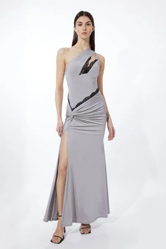 Make a statement with this maxi dress, crafted from sculpting jersey cut with a one shoulder design and thigh high split for a flattering silhouette. Featuring a dramatic cut out neckline with lace trimming and finished with a ruched twist detail. Pair with barely-there heels for elevated formal wear.LaceRuchedOne shoulderExpertly designed for those 5’3″ and under, our Petite pieces are perfectly proportioned for a smaller frame using shorter lengths.Details & CareMain: 95% Polyester 5% Elastane/Polyester. Lining: 95% Polyester 5% Elastane/Polyester. Lace: 90% Polyamide 10% Elastane. Gentle machine wash at 30 with similar colours. Model wears a S.
