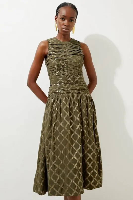 Bring in the summer with our petite midi dress, which features an ultra flattering fit and flare silhouette with a dropped waist and a belted waistline, as well as shimmering metallic detailing. Style it simply with strappy sandals or heels for a look that will take you from summer wedding guest days to date nights to holiday evenings.Petite Viscose Metallic Thread Beaded Woven Midaxi DressHigh Quality Viscose FabricShimmering Metallic Thread AccentsFlattering Fit and Flare SilhouetteDropped WaistStatement Beaded Trim DetailingRuched BodiceTextured, Flowing SkirtBelted WaistlineZip Back FasteningExpertly designed for those 5’3″ and under, our Petite pieces are perfectly proportioned for a smaller frame using shorter lengths.Details & CareShell: 89% Viscose/Rayon. 11% Metallised fibre/metallic fibre. Lining: 100% Cotton. Wash on a delicate cycle.