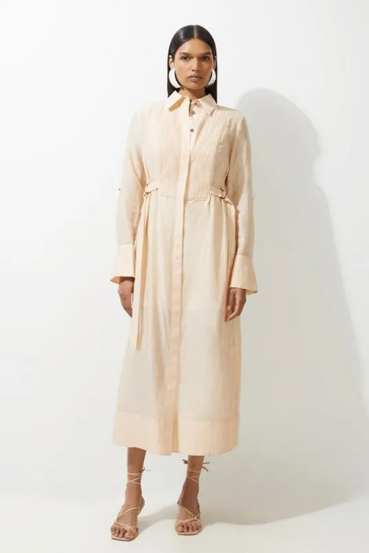 Get dressed up in our shirt dress, with a flowing, relaxed silhouette, and a pintucked panel in the front. The long hanging skirt makes for a versatile dress, able to be paired with sandals or loafers on a casual day, then with court heels or strappy stilettos for an evening look.Petite Organdie Pin Tuck Longline Woven Shirt Dress With Tab DetailHigh Quality Organdie FabricUnique Bib Panel in FrontTab Detailing at WaistlinePintuck DetailingComfortable, Relaxed FitMidaxi LengthButton Front DetailingExpertly designed for those 5’3″ and under, our Petite pieces are perfectly proportioned for a smaller frame using shorter lengths.Details & CareMain 45% Lyocell, 34% Linen, 21% Polyamide. Lining 100% Cotton. Wash with similar colours. length measures 135cm