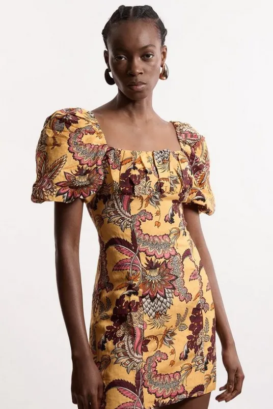 Petite Paisley Viscose Linen Woven Puff Sleeve Mini Dress