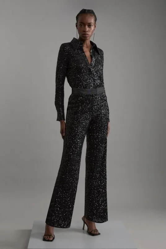 Get party season ready in a pair of dazzling sequin trousers, featuring a flattering, relaxed fit, sparkling, sequin fabric, and a comfortable high waistline. Style with anything, from a crisp button up shirt for a formal look, or with a T-shirt and trainers for a more laid back approach.Petite Sequin High Waisted Straight Leg TrousersHigh Quality Sequin FabricComfortable High WaistlineFlattering Straight Leg FitContrasting Waistband and PanelingDetails & CareMain: 96% polyester, 4% elastane. Model wears UK8. Length approx: 100cm
