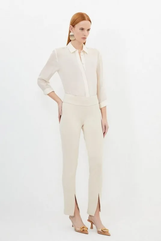 Exude undeniable sophistication in these leggings. A high waistline cinches the waist for a flattering fit, while a split hem detail adds a contemporary touch. From the office to evening drinks, these trousers can be relied on for every setting.Split hemLeggingsHigh waistExpertly designed for those 5’3″ and under, our Petite pieces are perfectly proportioned for a smaller frame using shorter lengths.Details & CareMain: 71% Viscose/Rayon 25% Polyamide 4% Elastane/Spandex. Dry clean only. Model wears UK Size 8/ US Size 4. Item length 60cm