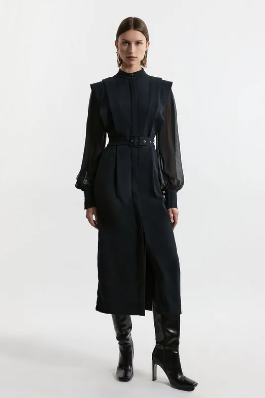 High neck design for a sophisticated lookCrinkle sleeves add texture and interestBelted waist for a flattering silhouetteMidi length perfect for versatile stylingStructured shoulders create a polished appearanceThis Karen Millen twill pencil midi dress embodies contemporary elegance with its unique design elements. The high neck and structured shoulders create a refined silhouette, while the crinkle sleeves add a touch of intrigue. The belted waist cinches in to flatter your figure, and the midi length offers versatility for various occasions. Style this dress for a family gathering or a casual daytime event by pairing it with sleek ankle boots and statement earrings. For a more relaxed look, layer it with a tailored blazer and wear with stylish trainers. This dress is a perfect addition to your wardrobe, offering a blend of sophistication and modern flair suitable for the discerning 30+ woman who appreciates quality craftsmanship and contemporary design.Expertly designed for those 5’3″ and under, our Petite pieces are perfectly proportioned for a smaller frame using shorter lengths.Details & CareMain: 100% Polyester. Lining: 100% Polyester. Model wears UK Size 10. length measures 125cm.