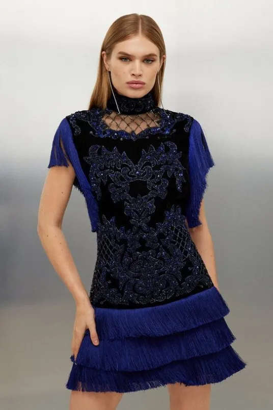 A scintillating Baroque embellished design is woven from a high neck and cascades to a sculpting bodice. Fringe detailing adorns a playful mini skirt and classic short sleeves for dramatic effect. Pair this piece with barely-there heels for formal wear that promises to exude glamour.Mini dressFringe detailingBaroque embellishmentHigh neckExpertly designed for those 5’3″ and under, our Petite pieces are perfectly proportioned for a smaller frame using shorter lengths.Details & CareShell: 100% Polyester. Lining: 100% Polyester. Hand wash separately in cool water using non-biological liquid detergent. Do not dry clean. Model wears a UK 8/US Size 6. Centre back length of a 8: 82cm