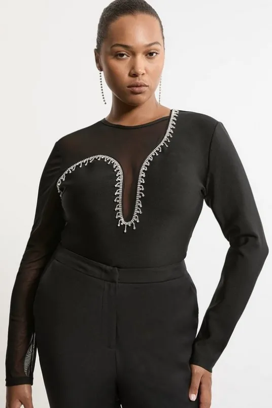 Get ready for the party in our bandage knit top! This eye-catching piece features tasteful mesh detailing and intricate embellishments, adding a touch of glamour to your look. Its unique yet simple design makes it easy to pair with trousers or skirts, depending on your style. Whether you’re heading out for date night or a night on the town, this top is suitable for any occasion, ensuring you feel confident all evening long.Plus Size Figure Form Bandage Mesh Detail Embellished Knit TopHigh Quality, Bandage KnitAsymmetric DesignPlunge Neckline with Embellished TrimMesh AccentsFull Length TopBack Zip FasteningExpertly designed for those UK size 18/US size 14 and above, our plus size clothing collection is perfectly proportioned to ensure you look stylish at every shape.Details & Care97% recycled polyester, 3% elastane. 30 degrees synthetic cycle. model wears a Plus XL.