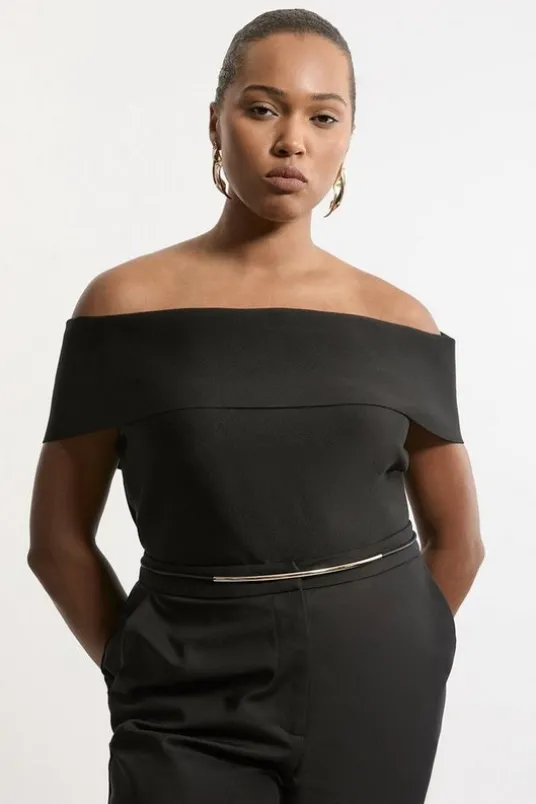 Deliver effortless sophistication in this plus size off the shoulder top, perfect for any occasion. Crafted from a soft knit, the double layer neckline cuts off at the shoulder to show off the decolletage and the top fits tight around the body for a figure-fitting shape. It features short sleeves and is ready to be styled with weekend denim or tailored trousers for a desk to dinner look.Plus Size Figure Form Bandage Bardot Knit TopSoft, Knit FabricFigure Hugging FitStraight, Bardot NecklineFlattering Off the Shoulder FinishShort Sleeve DesignZip Back Fastening Expertly designed for those UK size 18/US size 14 and above, our plus size clothing collection is perfectly proportioned to ensure you look stylish at every shape.Details & Care97% Polyester 3% Elastane. 30 degree synthetic cycle. Model wears UK XL.