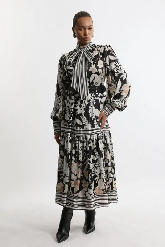 Striking floral print with contrasting striped detailsElegant high neck with a statement tie featureVoluminous long sleeves for a dramatic silhouettePleated midaxi length skirt for graceful movementFlattering waist-defining belt for a polished lookThis Karen Millen dress radiates sophistication with its bold floral print and refined details. The high neck with a striking tie adds a touch of drama, while the pleated midaxi skirt creates a fluid, feminine silhouette. Perfect for daytime events, style this dress with sleek ankle boots for a family gathering or a casual lunch date. The waist-defining belt accentuates your figure, making it an ideal choice for those seeking a put-together yet contemporary look. For a more relaxed approach, pair with stylish trainers and a leather jacket. This versatile piece effortlessly transitions from day to evening, allowing you to showcase your polished style at various casual occasions throughout the season.Expertly designed for those UK size 18/US size 14 and above, our plus size clothing collection is perfectly proportioned to ensure you look stylish at every shape.Details & CareMain: 100% Polyester. Lining: 100% Polyester. Wash inside out. Model wears UK Size 18. Length measures 130cm.