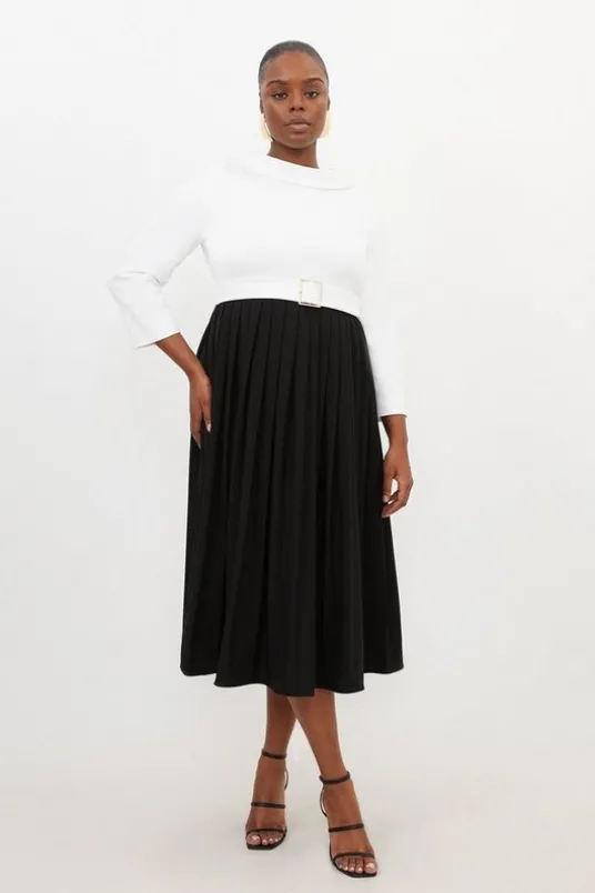A classic and timeless aura exudes from this midi dress, tailored with premium crepe for a seamless and structured fit. Elevated with a turtleneck, three-quarter sleeves and a belted waist cut by a full pleated skirt for a flattering silhouette. Pair with stilettos for an elegant ensemble.Midi lengthPleatedThree-quarter sleevesBeltedExpertly designed for those UK size 18/US size 14 and above, our plus size clothing collection is perfectly proportioned to ensure you look fashionable at every shape.Details & CareMain: 34% Viscose, 32% Polyester, 30% Polyester, 4% Elastane. Lining: 100% Polyester. Dry Clean Only. Item length 120cm