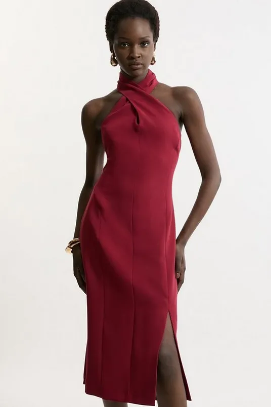 Soft Tailored Color Block Tailored Halter Neck Midi Dress