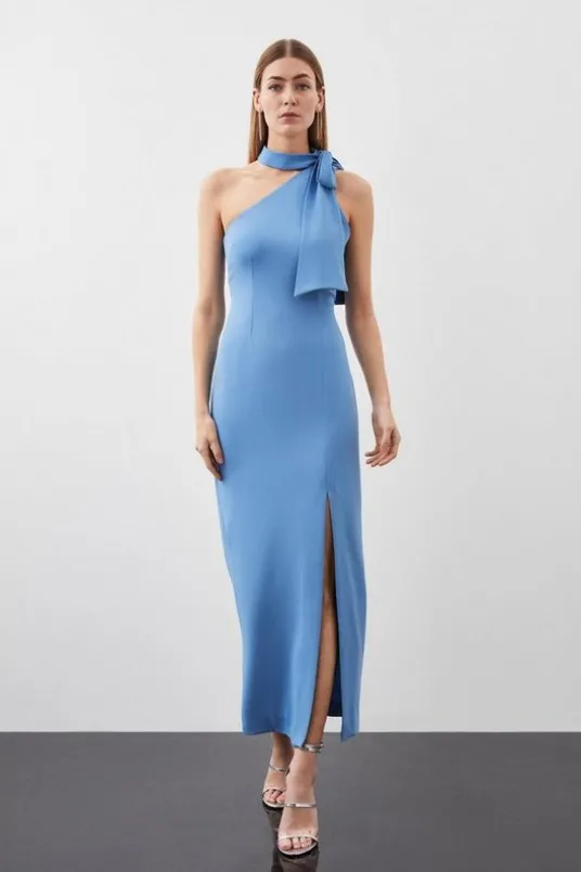 Feel formal in our midi dress, with a sleek, minimal design and a bow accent at the neck. The thigh high leg split not only makes a statement, but allows for smooth movement. Style this dress with strappy heels for an outfit that will turn heads from wedding guest days to upcoming occasions and events.Soft Tailored Tie Neck Midi DressUnique Tie Accent at NeckSummery, One Shoulder DesignFlattering Figure Hugging SilhouetteThigh High Leg SplitMidi LengthButton Fastening Behind NeckZip Fastening on SideDetails & CareMain: 100% polyester, Lining:100% Polyester. Dry Clean Only. Model wears UK size 8/ US size 4. Model height :5’9. Centre back length:119cm