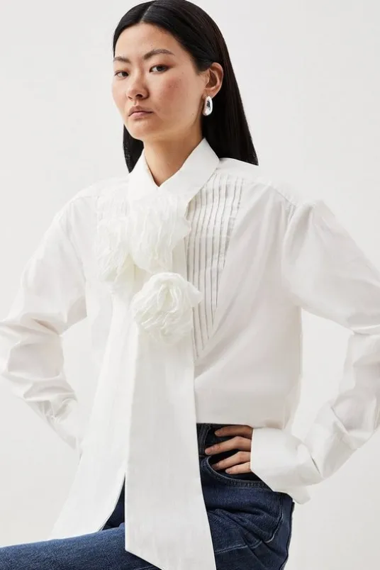 Embrace effortless elegance with this shirt. Ideal for days that require something a little different, this cotton shirt features a flattering, relaxed silhouette, as well as a rosette design at tehe neck to elevate the formality and put a twist on the traditional. Style with tailored trousers or jeans and loafers for an elevated daytime look.Cotton Stripe Print Rosette Woven ShirtHigh Quality Cotton FabricButton Down FasteningThree Dimensional Rosette AccentsComfortable, Relaxed FitClassic Stripe PatternDetails & Care100% cotton Gentle machine wash at 30 with similar colours. Model Height 5”10 – Model wears a UK 8/US Size 6.
