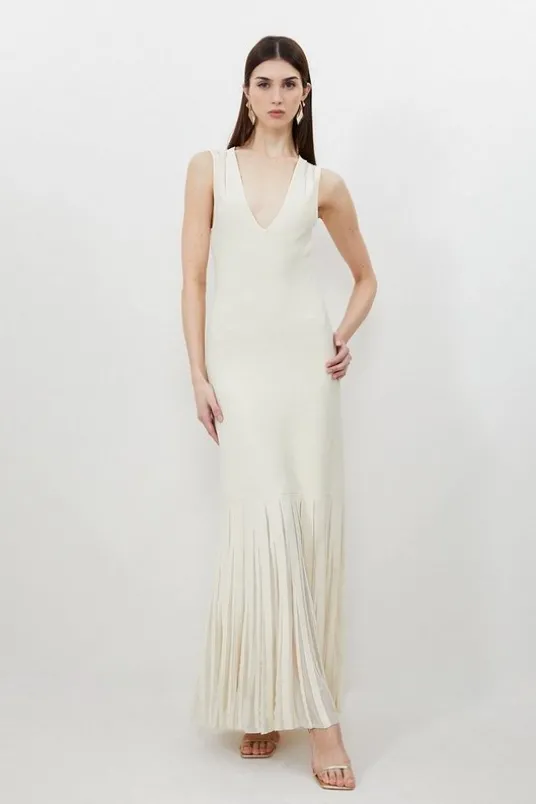 A classic silhouetted dress is crafted from viscose that elegantly drapes the bodice with elegance. Designed with a plunging neckline, sleeveless shoulders, and a mermaid skirt for dramatic flare, while a sheer back detail adds allure.Plunging necklineSleevelessMaxi lengthDetails & Care100% Viscose. Cool Hand wash Only. Model wears UK Small. Small centre back length approx 145cm