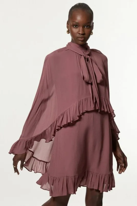 Add a little formality in our mini dress. The ruffled design gives a playful yet elevated feel, and the relaxed silhouette makes for a comfortable dress that can be worn from day to night. This piece pairs well with anything, from statement heels to heeled boots to chunky loafers for day to night looks.Viscose Georgette Cape Woven Mini DressHigh Quality Georgette FabricTextured, Ruffled DetailsHigh NecklineRelaxed FitTie Neck AccentDetails & Care100% Viscose/Rayon. Lining: 100% Polyester. Wash inside out. Model wears UK Size 10. Length 90cm