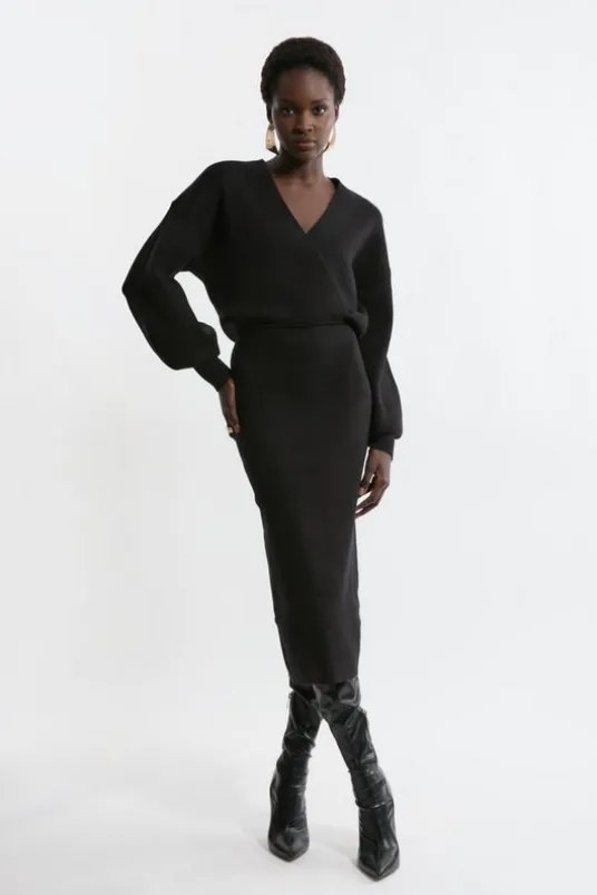 Wool Look Blouson Sleeve Midaxi Knit Pencil Dress