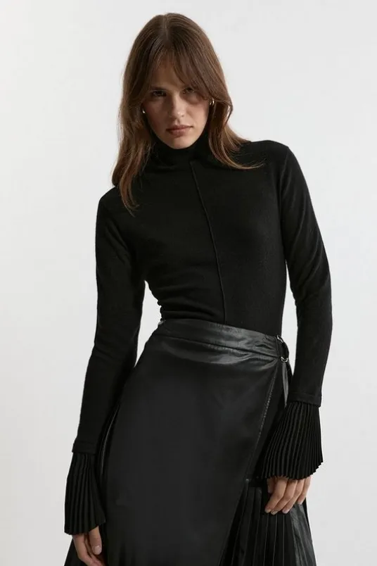Alpaca Wool Blend Pleated Silk Woven Cuff Knit Top