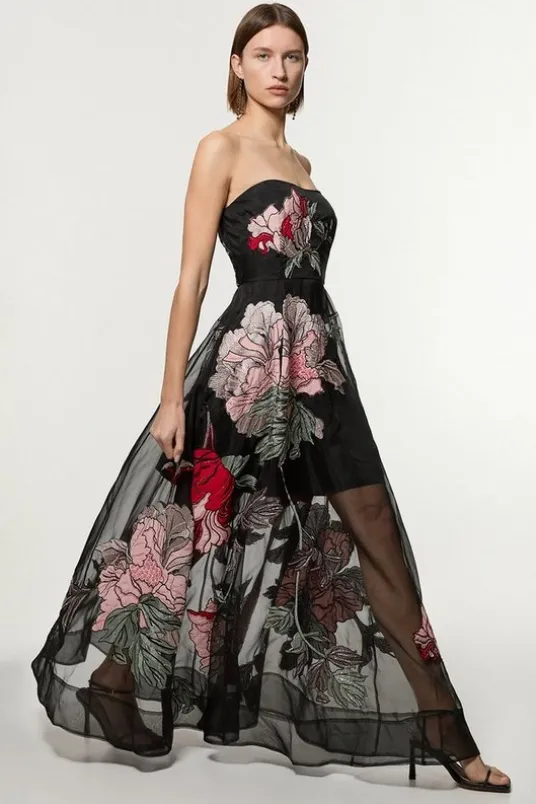 Applique And Embroidered Organdie Woven Midaxi Bandeau Dress With Beading