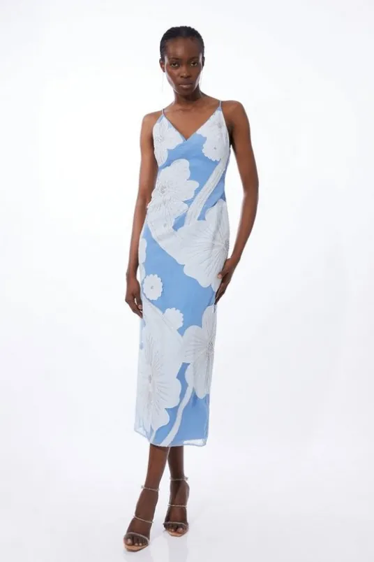 Blooming with a floral print, this dress is cut with a classic silhouette featuring cami straps, a V-neckline and midi length. Crafted from soft satin organdie for an ethereal effect, this piece can be styled up or down with heels or flats.OrgandieFloral printMidi lengthDetails & CareMain: 100% Polyester. Lining: 94% Polyester 6% Elastane. Embroidery: 100% Polyester. Hand wash separately in cool water using non-biological liquid detergent. Do not dry clean. Model wears a UK 8/US Size 6. Centre back length of a 8: 135cm