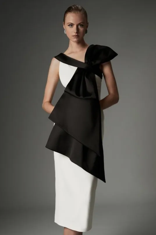 KM ARCHIVE pays homage to Karen Millen’s design-led legacy. Three original pieces have been lifted from the ‘00s archives and reconstructed into a new collection, presented for cocktail hour AW24.Feel confident in our midi dress, featuring an off shoulder cut, and a straight hanging skirt. The large, three dimensional bow detail is perfect for adding a whimsical, feminine type of glamour to any occasion look. Style it with block heels or strappy stilettos for a look ideal for race days and formal occasions.Archive Collection – Bow Detail Off The Shoulder Crepe Woven Midi Dress High Quality Crepe Fabric Flattering Fitted SilhouetteUnique, Off Shoulder AccentStriking Bow AccentThigh High Leg Split in Back Discover the full story behind the collection here.Details & Care96% viscose, 4% elastane. Dry clean only. Model wears size UK10. Length approx: 125cm
