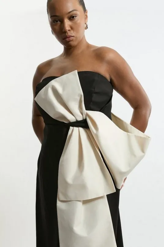 KM ARCHIVE pays homage to Karen Millen’s design-led legacy. Three original pieces have been lifted from the ‘00s archives and reconstructed into a new collection, presented for cocktail hour AW24.Feel confident in our plus size midi dress, featuring a one shoulder cut, and a straight hanging skirt. The large, three dimensional bow detail is perfect for adding a whimsical, feminine type of glamour to any occasion look. Style it with block heels or strappy stilettos for a look ideal for race days and formal occasions.Archive Collection – Plus Size Bow Detail One Shoulder Crepe Woven Midi DressHigh Quality Crepe FabricFlattering Fitted SilhouetteUnique, One Shoulder DesignStriking Bow AccentThigh High Leg Split in BackExpertly designed for those UK size 18/US size 14 and above, our plus size clothing collection is perfectly proportioned to ensure you look stylish at every shape. Discover the full story behind the collection here.Details & CareMain: 96% viscose/rayon 4% elastane/spandex . Lining: 100% polyesterDry clean only. Model wears a UK 18/US Size 14. Length: 112cm