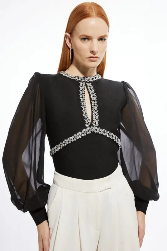 Bandage Embellished And Chiffon Sleeve Figure Form Knit Top