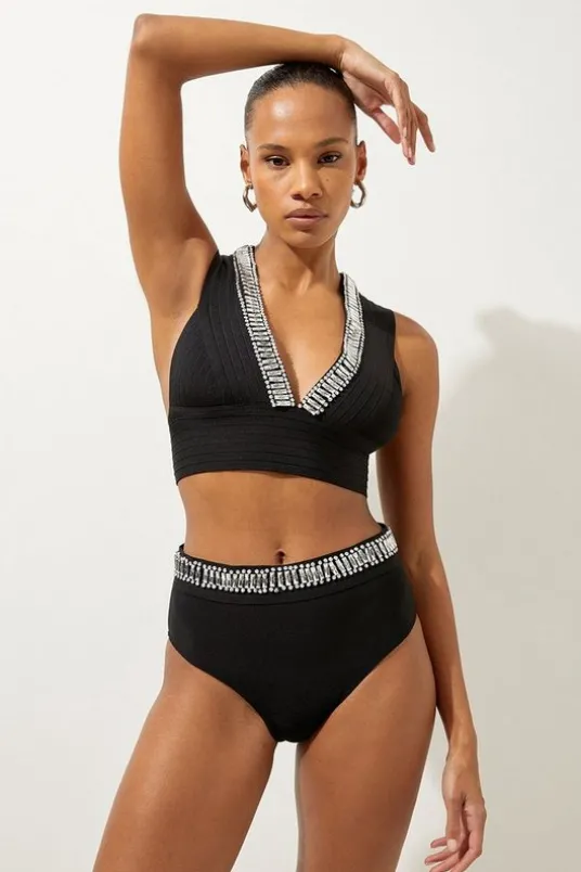 Welcome the sun with a bikini that will turn heads, the top of which features an ultra flattering plunge neckline and sparkling beaded detailing, as well as wide shoulder straps, and ultra secure zip fastenings. Style this piece with the matching bottoms, as well as strappy sandals and a beach cover up for a holiday look that can be reworn time and time again.Bandage Embellished Trim Cut Out Bikini TopSparkling Beaded EmbellishmentsStatement Plunge NecklineSupportive DesignComfortable, Wide Shoulder StrapsSecure Zip Fastening in BackMatching Bottoms Sold SeparatelyDetails & Care97% Polyester, 3% Elastane. Wash with similar colours. Model wears Size Small. Model height approx 5″9.