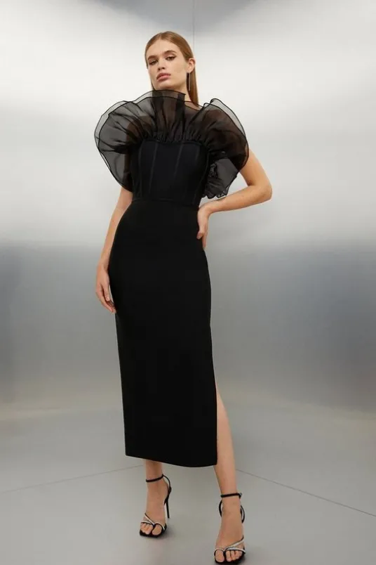 A walking work of art, this dress makes an unforgettable entrance. Bandage fabric sculpts the silhouette, while a corset bodice is adorned with layers of organza frill, creating a high-drama look.Bandage fabricCorset bodiceBandeau dressOrganza frill detailDetails & Care97% Polyester 3% Elastane. Dry Clean Only Model wears UK Small. Small centre back length approx 115cm