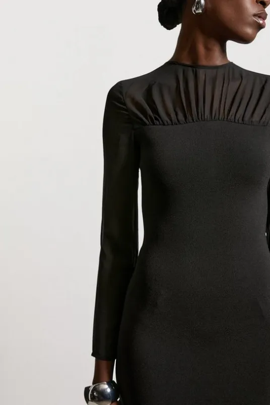 Get occasion ready in Karen Millen’s maxi dress, made in soft knit fabric, featuring a figure hugging fit through the hips, and a straight hanging skirt with pleat detailing in a sheer fabric. Style it simply with strappy sandals or heels for a look that will take you from summer wedding guest days to date nights to holiday evenings.Bandage Figure Form Woven Mix Knit DressSeamless Knit FabricFlattering Figure Hugging SilhouetteStraight Hanging SkirtStatement Sheer Detailing on Skirt and SleevesTextured Pleated SkirtZip Back FasteningDetails & Care55% Viscose Filament 43% Polyamide 2% Elastane. Wash with similar colours. Model wears UK S. Small centre back length approx 125cm