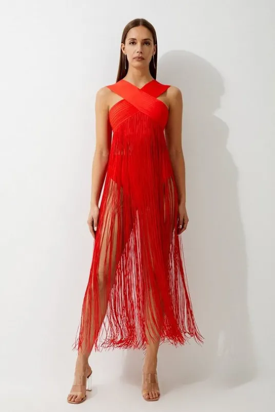 Pack a burst of confidence in your suitcase before jetting off this year with our bikini. This piece features a supportive design, accentuated with a crossed, halter neckline, and fringe that flows to the ankles and creates enchanting movement as you want, dance, and swim. Style this piece with the matching bikini bottoms and strappy sandals for a holiday outfit perfect for beach clubs, pool parties, and spa days.Bandage V Neck Cut Out Fringed Bikini TopSupportive, Wide Shoulder StrapsUnique, Long Fringe AccentCrossed Halter NecklineSecure Zip Fastening in BackMatching Bikini Bottoms Sold SeparatelyWhilst appropriate for a beach destination, please note that in order to ensure enduring quality, this piece is not recommended for swimming.Details & Care97% Polyester, 3% Elastane. Wash with similar colours. Model wears Size Small. Model height approx 5″9.