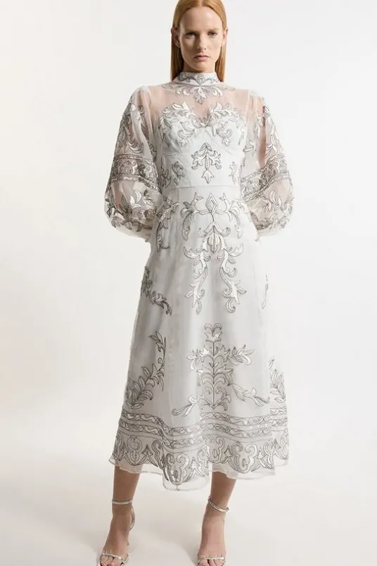 Make an elegant entrance at your next event in our formal maxi dress. This piece is crafted with high quality organdie fabric and features a maxi hemline, long balloon sleeves a unique, baroque style print. Style this dress with court heels or sandals for an occasion look that promises to impress.Long SleevesBaroque DesignApplique DetailsMaxi HemlineDetails & CareModel wears size UK 10, Model height 5’10, Length measures 135cm