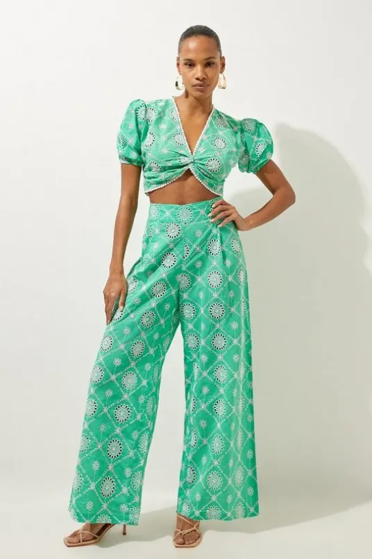 Feel summer ready in our co-ord set, made in textured broderie fabric, featuring a crop top with puffed sleeves and a plunge neckline, and matching wide leg trousers. Style it with sandals for a look ideal for upcoming hot days and holidays.Beach Cotton Broderie Trouser And Top Co-ordTextured, Broderie FabricCropped Length TopTwist Accent at BustPlunging V NecklineBold Floral Design Comfortable, High Waistline Trousers Statement, Wide Leg Fit Elasticated WaistbandDetails & Care100% Cotton. Gentle machine wash at 30 with similar colours. Model Height 5”10 – Model wears a S.