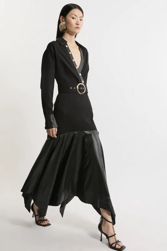 Belted Pu And Ponte Jersey Frill Hem Midi Dress