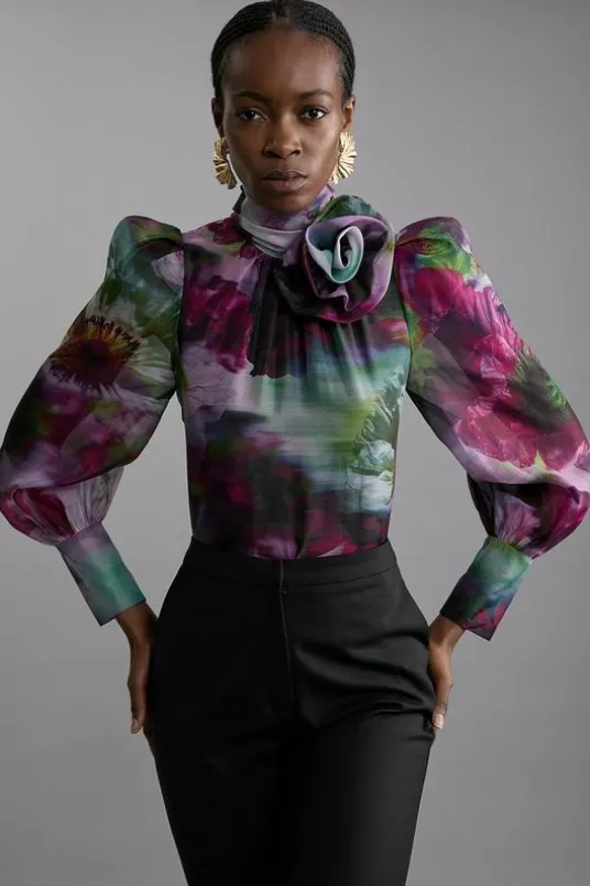 Elevate your top selection with our blouse, which boasts a relaxed fit, a rosette detail at the high neckline, and a statement bow accent in the back, ideal for enriching your occasion wear collection. This piece pairs well with anything, from a fitted midi skirt, to tailored trousers, to jeans for an elevated look that will take you seamlessly from day to night.Blurred Floral Tie Detail Woven Organdie BlouseHigh Quality Organdie FabricUnique, Three Dimensional Rose Accent Vibrant, Blurred Floral Print Playful Balloon SleevesComfortable, Relaxed FitFormal High Neckline Statement Bow Accent in Back Keyhole Back AccentButton Fastening Behind NeckDetails & Care75% Viscose/Rayon 23% Lyocell 2% Linen. Gentle machine wash at 30 with similar colours. Model Height 5”10 -Model wears a UK 10/US Size 8.