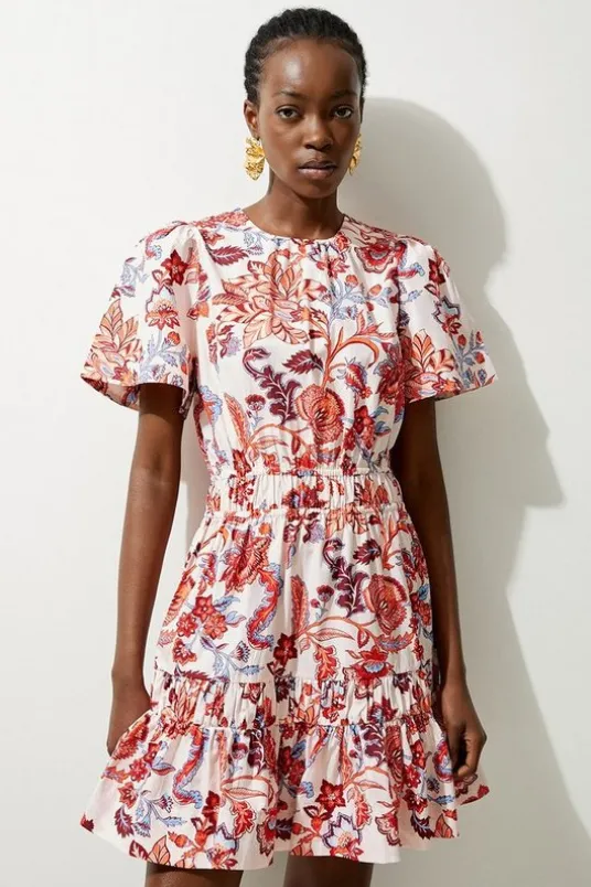 Turn heads in this breathable, feminine day dress. This floral summer dress comes in lightweight cotton and features a practical mini length that hits the thigh, a comfortable relaxed fit with a cinched, elasticated waist that teases your silhouette, and a modest high neckline that sits at the base of the neck. The dress also features voluminous short sleeves, and romantic drop tiered detailing at the base. The perfect choice for garden parties and summer weddings.Mini Summer Day Dress Breathable Cotton FabricFlattering Fit and Flare SilhouetteFeminine Floral DesignModest Cap SleevesTimeless High Neckline Details & CareMain: 100% Organic Cotton. Wash separately. Model wears UK Size 8/ US Size 4. Model height approx: 5″9. Length approx: 90cm